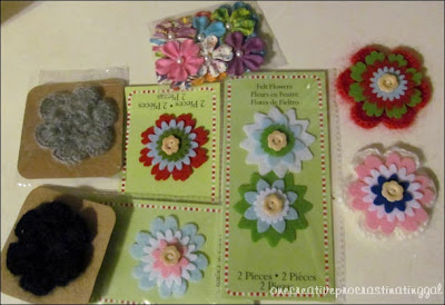 After Christmas I picked up a few random felt flowers, crochet flower pins and paper flower accessories on sale for only .50 at Micheals. I am always on the look out for a great deal. I went into the store for little 110 piece art sets for 2.49 and came out with a bag full. Little note books, magnet note pads, pencils, smelly hand soap and other stuff. I did buy the pencils for Kaylei's pencil box. The little note books, magnet note pads, soaps, art sets and a pack of pencils, along with a bunch of other stuff went in a bin for the the local Battered Women and Children's Shelter so it really was worth it and it always feels really good to give back. I can only hope that it made someones day a little brighter to get a goody bag for the holidays and to know someone was thinking about them.